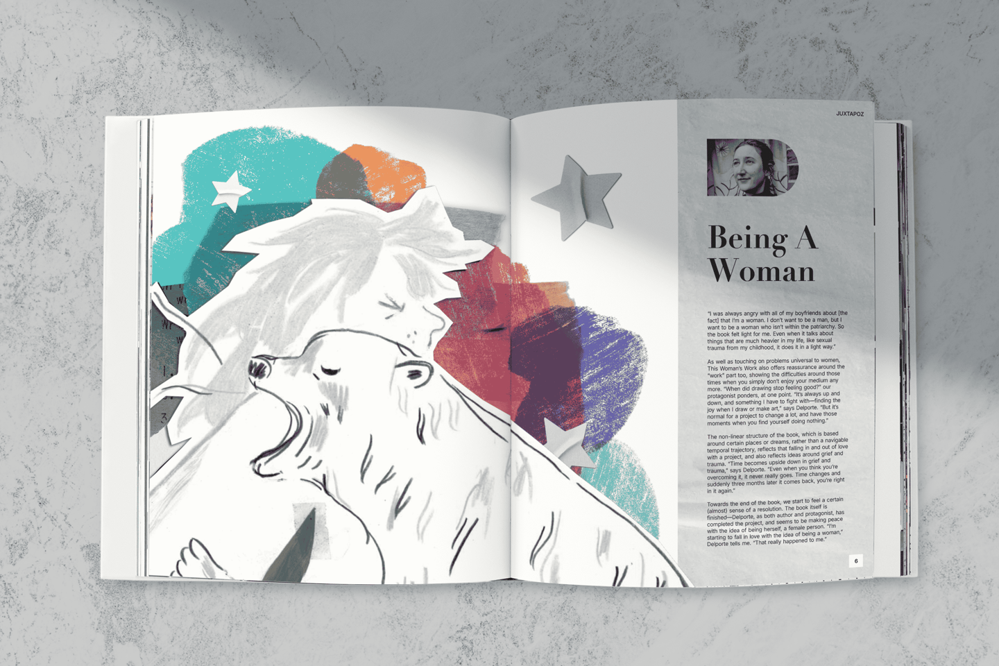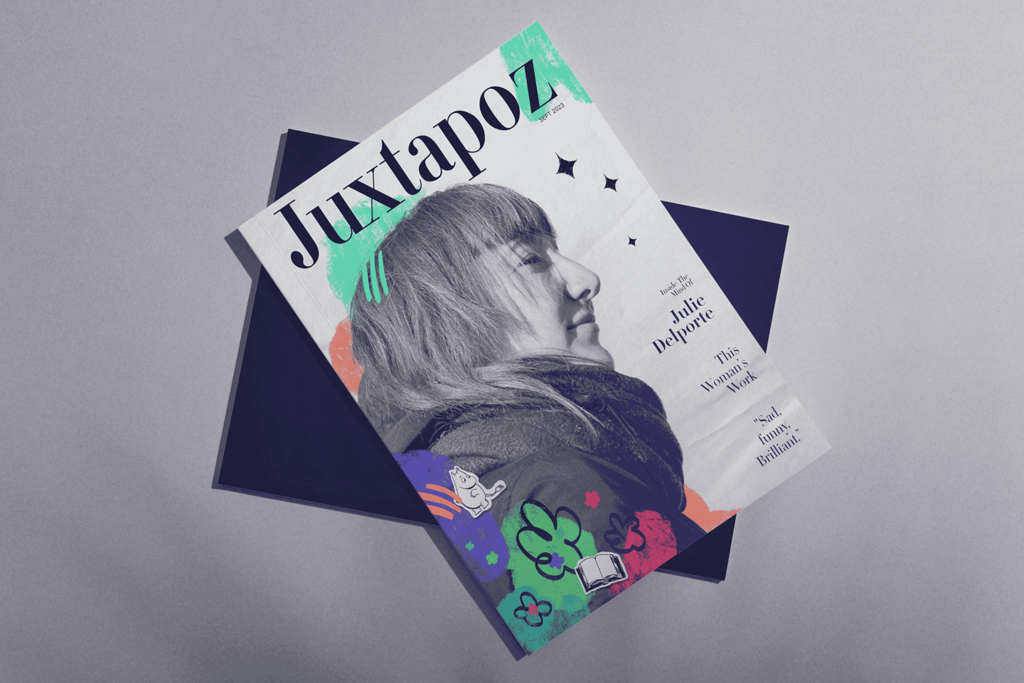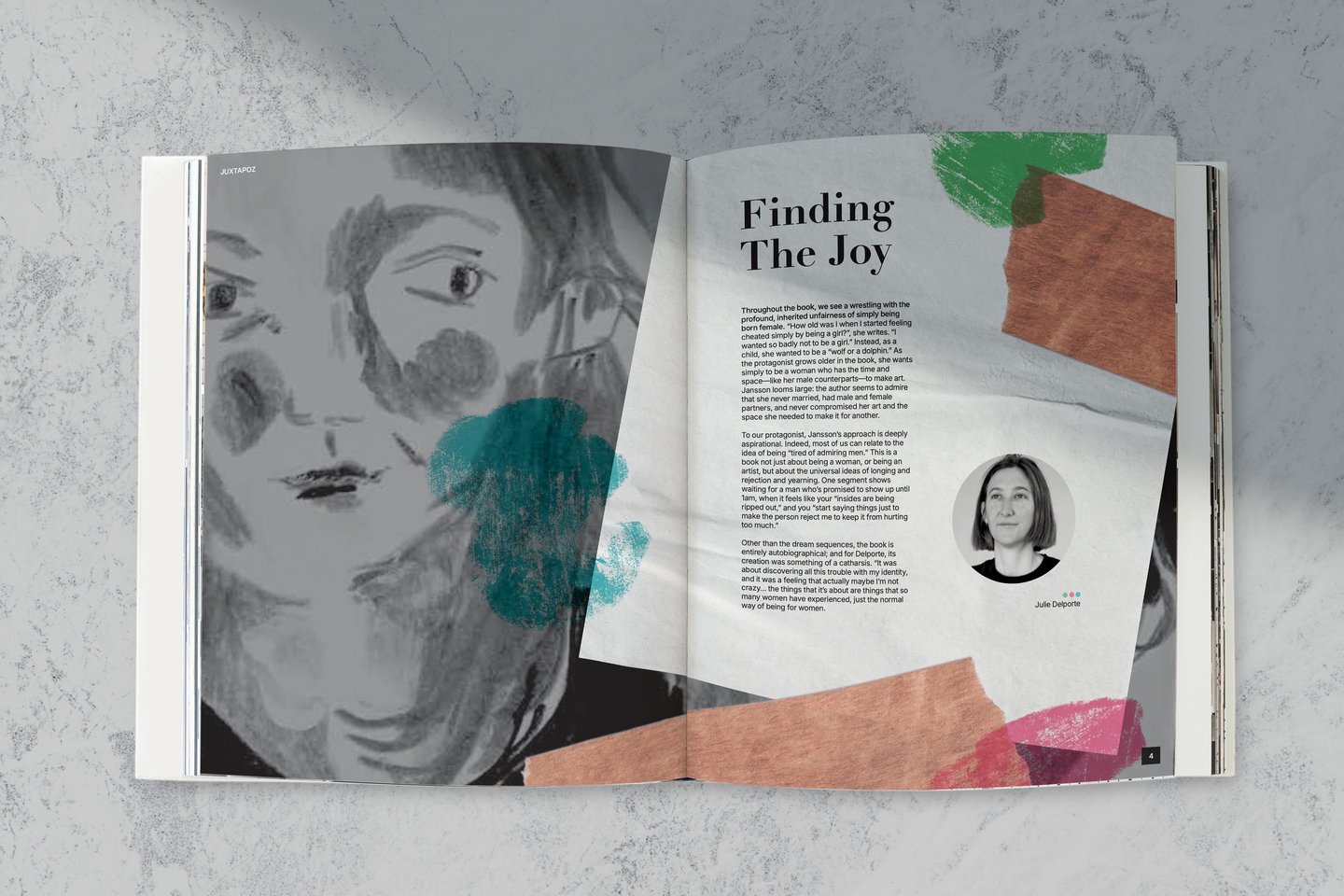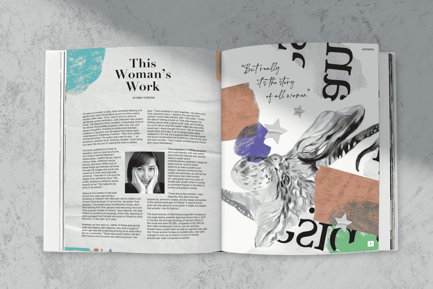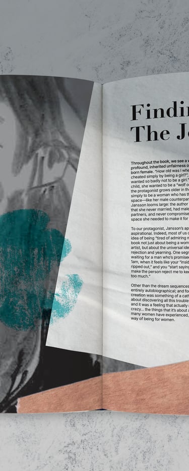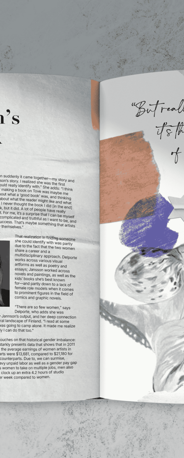 I created this publication spread about the artist Julie Delporte using the article An Exploration of Female Trauma, the Patriarchy + Why Tove Jansson is the Ultimate Role-model by AIGA Eye on Design to explore playful, collage-focused and illustrative compositions.