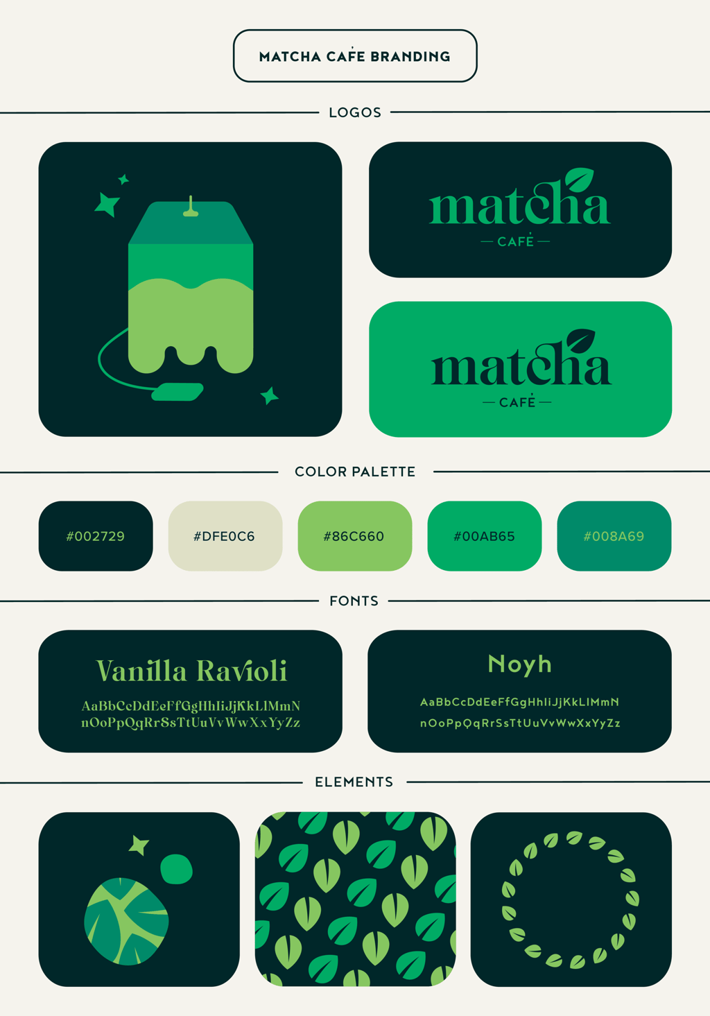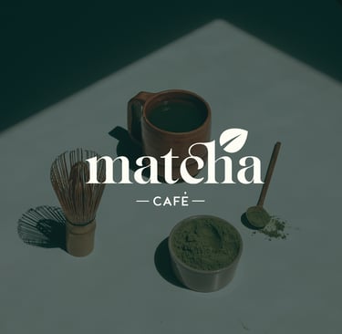 Matcha Cafe is the name of a fictional coffee shop company that is dedicated to serving delicious coffee and tea while providing a quiet and comforting atmosphere to create a unique customer experience. The company's calming presence is reflected in the soft, earthy green color palette used and the brand's round yet sleek primary typeface.