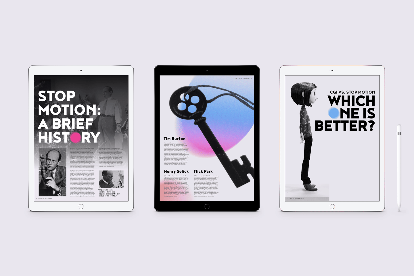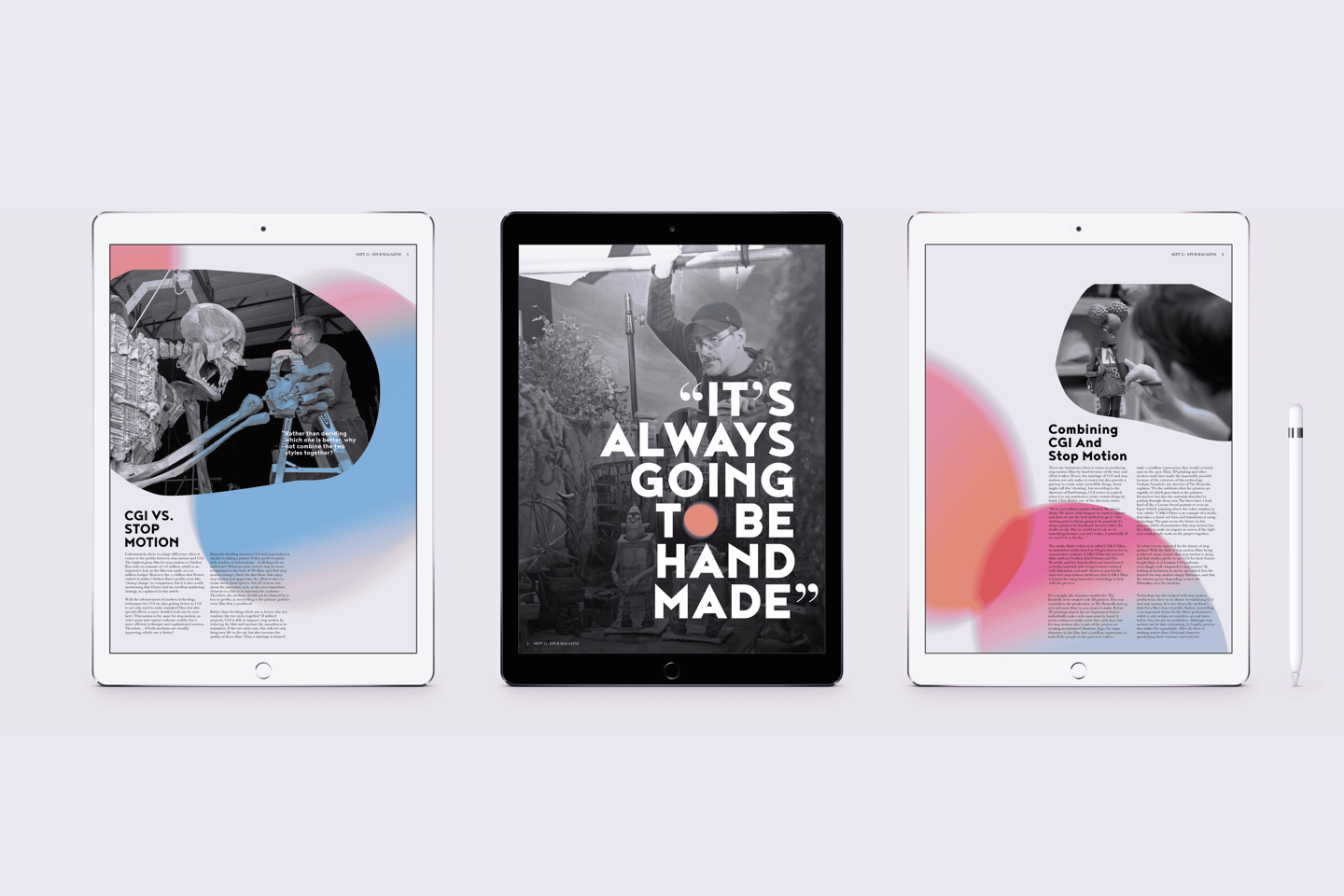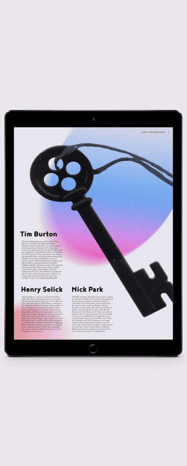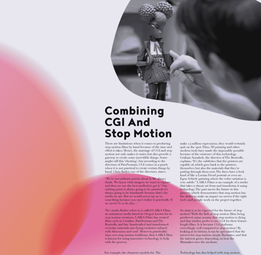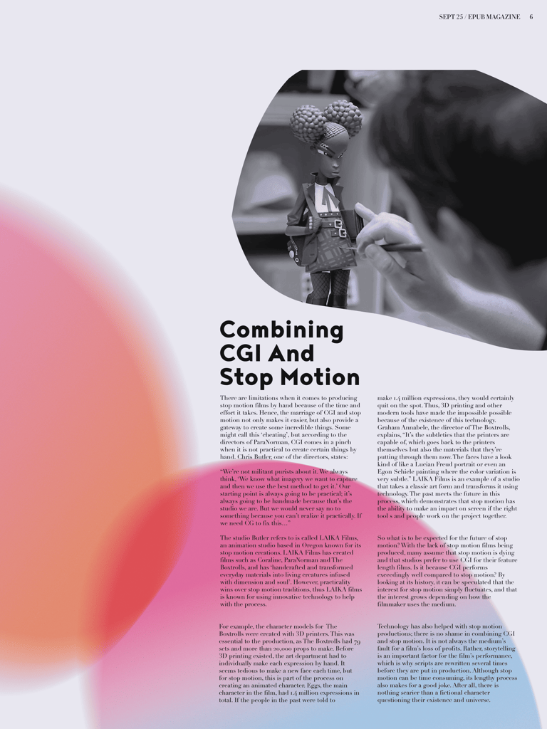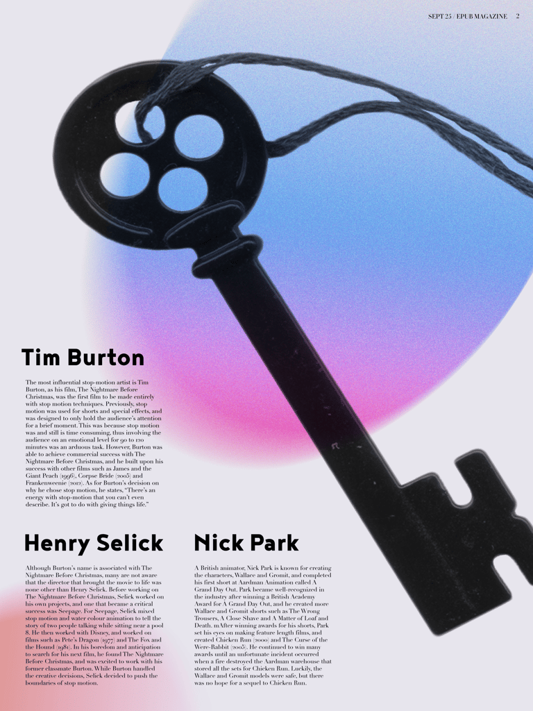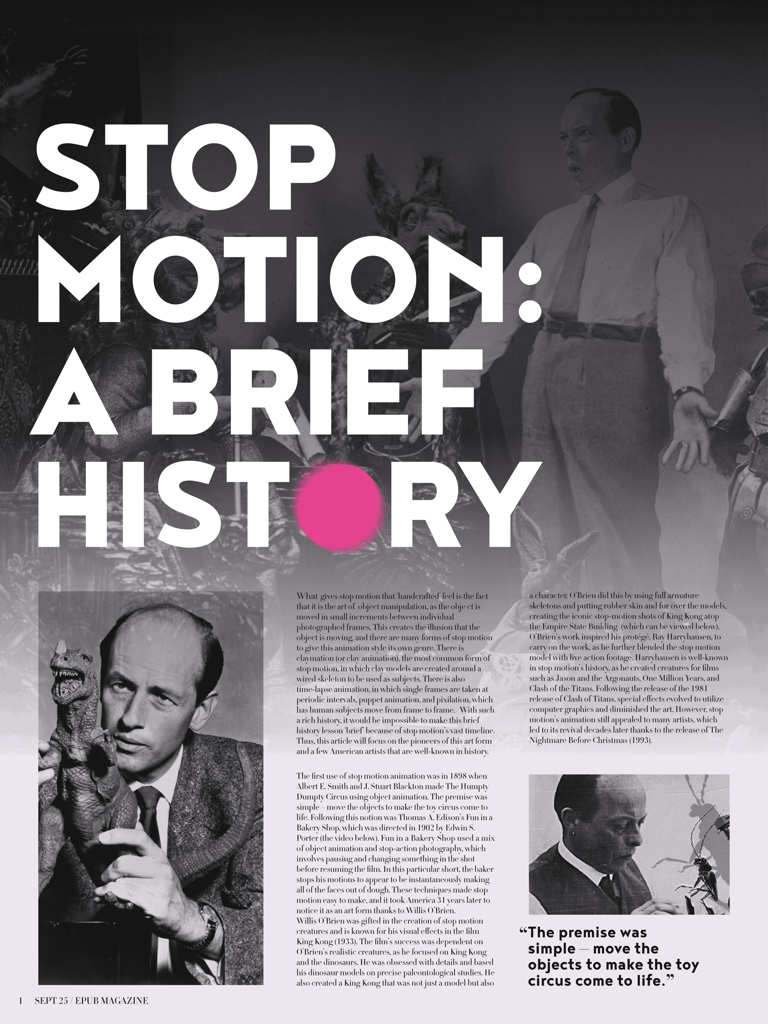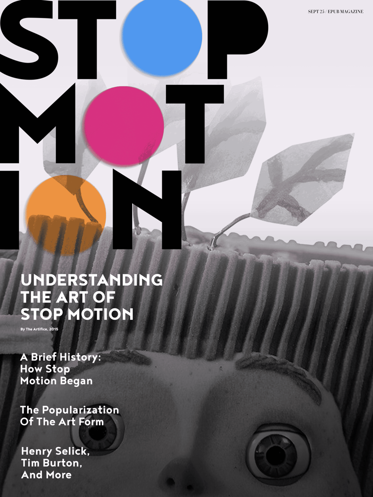This electronic publication of an existing article by The Artifice, titled Understanding the Art of Stop Motion touches on the history of the art form and the important people involved in the film genre. I created compelling, colorful editorial spreads that emphasize the uniqueness of stop motion animation and ultimately show my own fascination towards the art form.